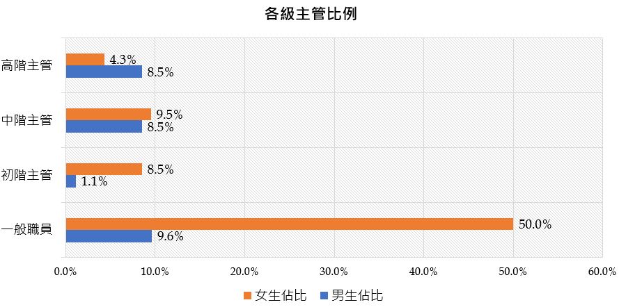 - 重視性別職場平等,實現男女擁有同工同酬的獎酬條件及平等升遷機會,113年度女性職員平均占比為72.30%,113年女性主管在各階級均占有一定席次。