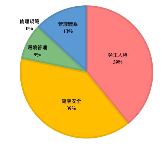 依據RBA行為準則,訂定全宇昕供應商暨託外加工廠RBA企業社會責任履行承諾書,要求供應商簽訂承諾書。於2023年進行3家供應商實地稽核,無重大缺失項,缺失項目分析如下圖所示。